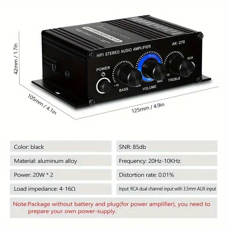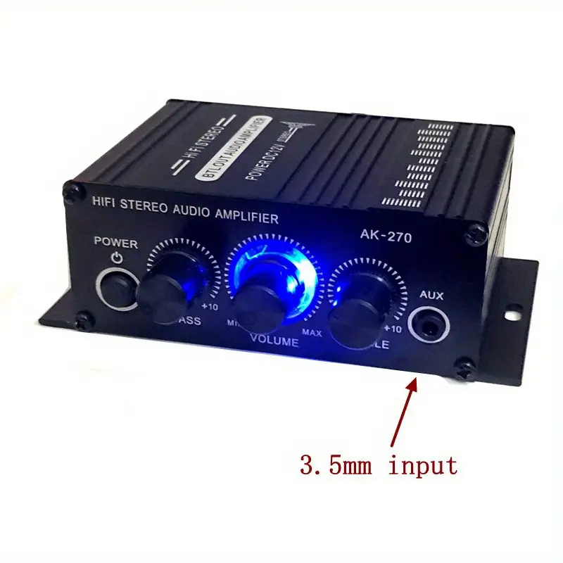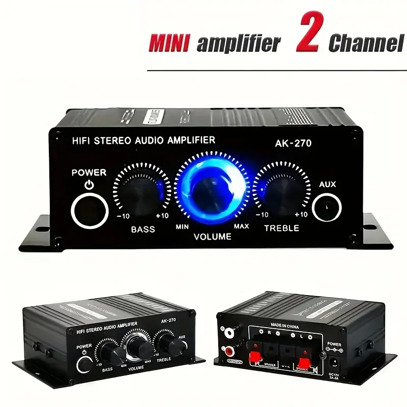 Upgrade your sound with the AK270 2 Channel Amplifier, delivering 20W x 2 RMS power with 3D stereo audio, deep bass, and treble control. Built from durable aluminum alloy with a sleek black finish and stylish blue LED knobs, this compact amp is perfect for: