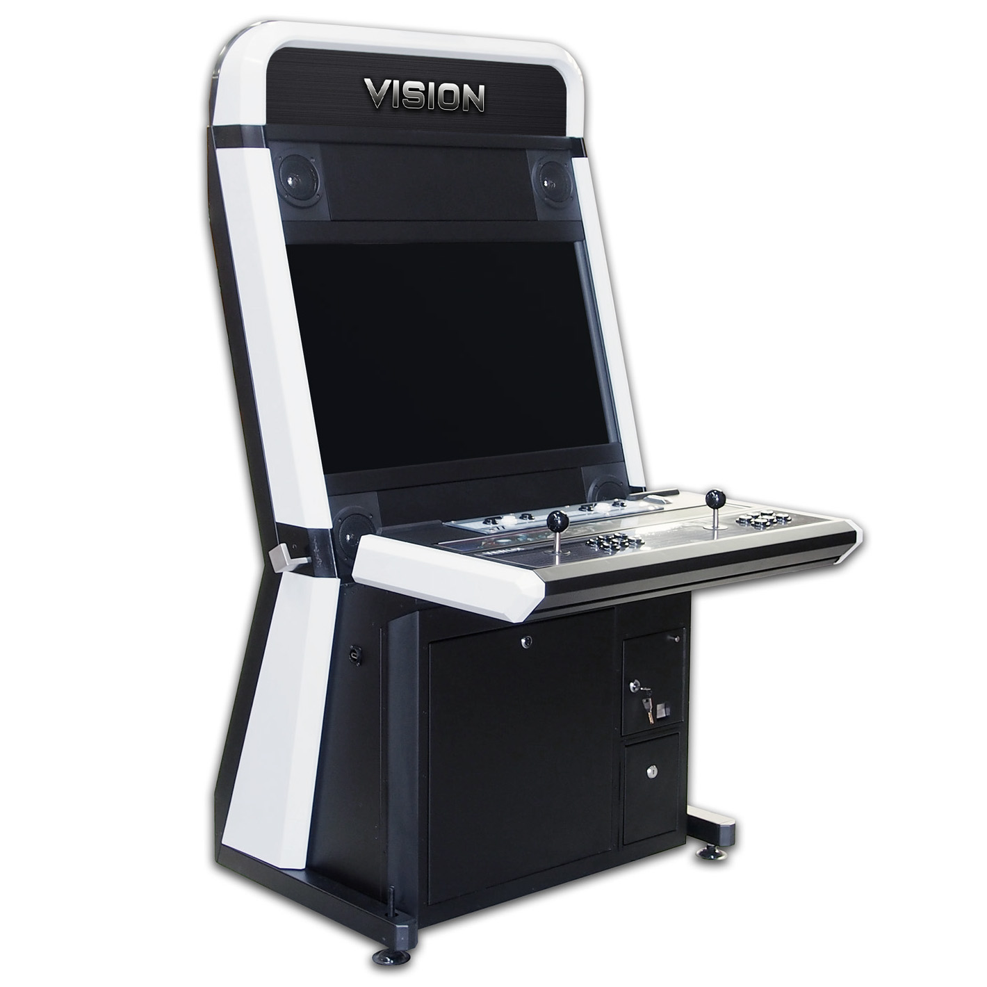 Experience the Vision Arcade Machine with a massive 32″ LCD, folding control panel, and premium game pack. Sleek design, sit-down comfort, 2-player setup.